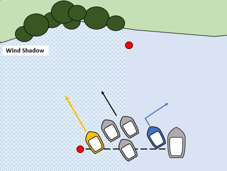 For example: if you know there is going to less wind on the left-hand side of the course due to a bank of trees on the shoreline, you will want to avoid sailing across to that side. Instead, being free to tack onto port and sail up the right side of the beat in more wind is the preferred option. Therefore, starting at the starboard end of the line will mean more opportunity to tack out onto port early and less risk of being forced into the wind shadow by the other boats around you.